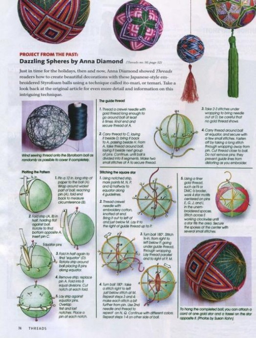 Темари – японское искусство вышивки шаров, которое постигают около шести лет. В Японии несколько уровней обучения этому виду рукоделия, но наши мастерицы пошли дальше. Кроме классических темари, они создают пирамиды, украшения, экспериментируют с гладью, бусинами, пайетками, вязаными декоративными элементами. Итак, давайте освоим основные уроки по созданию необычных шаров.