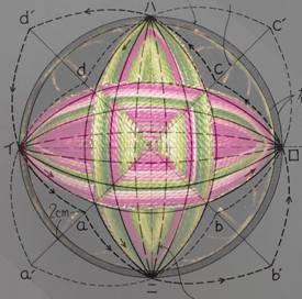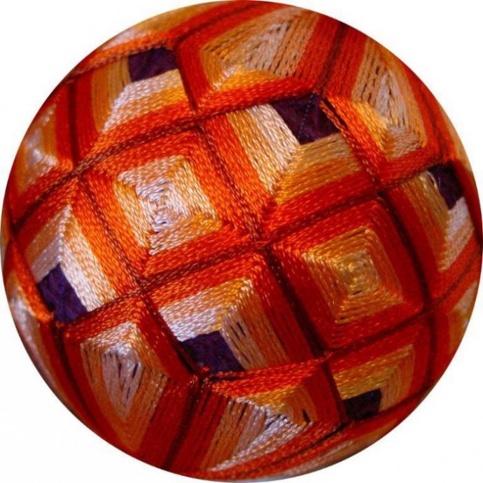 Переплетаем ромбы Возьмите темари и разделите его на экватор и 8 секторов. Теперь в каждом полушарии половину меридиана разделите на два и отметьте булавками. Это будут углы ромбов на темари. Мастер-класс по разметке шара описан выше при рассмотрении вышивки крыльев. Затем экватор делится еще раз пополам. Именно эти метки будут определять ширину ромба. Далее вышиваете ромб. От вершины разметочной булавки северного полюса делаете стежок у разметки экватора, далее переходите в вершину метки на южном полушарии. Захватываете разметку на экваторе и переходите в вершину на северном полюсе.