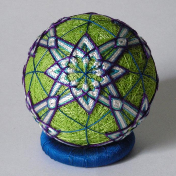 Создаем хризантему Перейдем к цветочным узорам для темари. Мастер-класс по вышиванию хризантемы требует внимания и сноровки. Делаете разметку на 8 или 12 секторов, чем больше, тем пышнее получится цветок. Далее мысленно делите расстояние от полюса до экватора на три части и вставляете по каждому меридиану на одну треть от экватора булавки. Это и будет размер хризантемы. Теперь нитками вышиваете своеобразную четырехзначную звезду. Затем по этой же схеме создаете фигуру, которая как бы накладывается на первую. Чтобы было удобно видеть углы звезд, при делении лепестков чередуйте булавки двух цветов. В результате получится по четыре булавки каждого цвета, образующего квадрат.