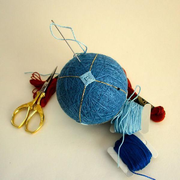 В нашей стране эти изделия применяют как украшение дома, автомобиля, елки, брелоков и даже изготавливают по их типу бусы, браслеты, серьги. В зависимости от функции изделия берется тот или иной материал: для елочных украшений – пенопластовая основа, для игрушек – ткань. Для любого темари понадобятся следующие материалы: пенопласт или колготки, ткань, целлофан; шерстяные, хлопковые и швейные нитки; ножницы; 30-сантиметровая бумажная полоска шириной 0,7 мм; сантиметровая лента; булавки; иглы разной длины. Если за основу взята пенопластовая форма, то обматываете ее шерстью без просветов, а потом катушечными нитками. Перематываете туго в разных направлениях. Как только закрыли все просветы, в иголку вставляете конец нитки (около метра) и в разных направлениях закрепляете переплетения клубка небольшими стежками.