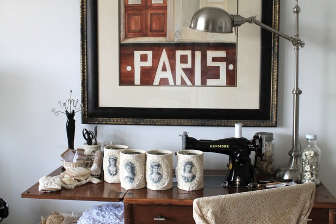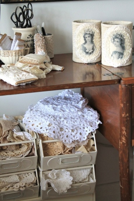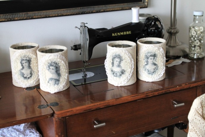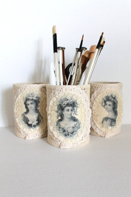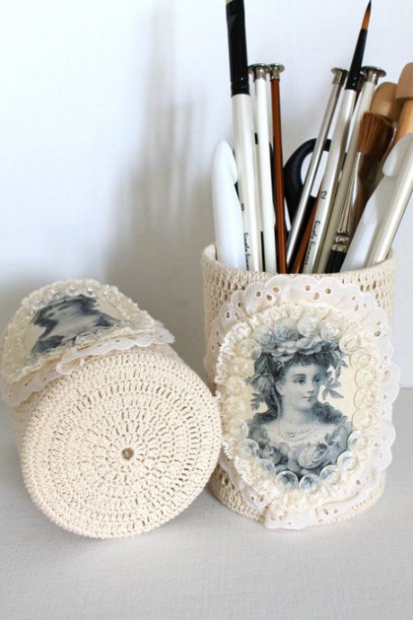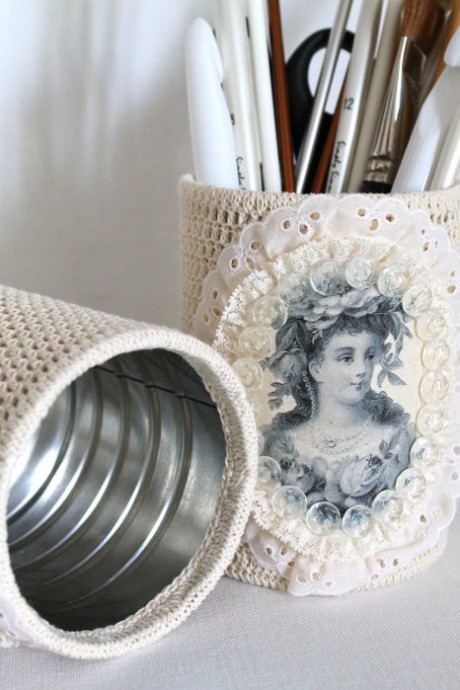 Очень понравилась мне эта идея преображения железных баночек. Баночка обвязывается крючком столбиками с накидом и украшается винтажным изображением. Само изображение распечатано на принтере и украшено кружевом и пуговичками. Ниже - много картинок с изображением девушек для распечатки.