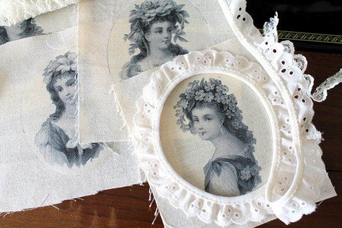 Я распечатываю на тонкой бумаге. Если удается достать слоистую бумагу, то на ней, а потом НАСУХУЮ отделяю первый слой и приклеива. на ПВА или клеем для ткани на ткань. С изнанки проглаживаю утюгом. ГОтовое изделие (картинку) можно покрыть аэрозольным лаком для декупажа.