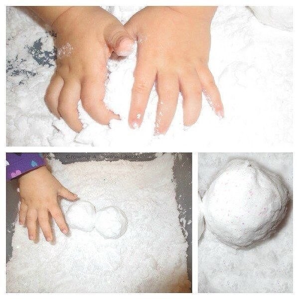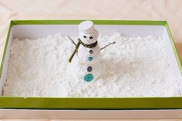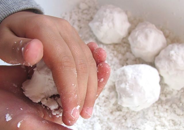 Рецепт очень простой: берете соду и добавляете в нее пену для бритья. Все смешиваете и в результате химической реакции получается самодельный снег, с которым интересно играть. Кроме того, такое занятие полезно для развития тактильной чувствительности у детей и взрослых.