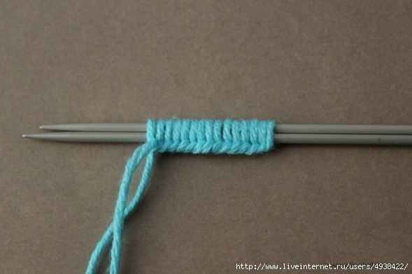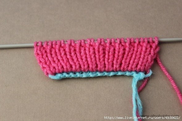 Набрать на спицы половину от нужного количества петель - это контрастной нитью. Больше эта нить не понадобится и ее можно обрезать, чтобы не мешала дальнейшей работе.