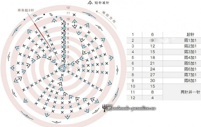 - Схема вязания круглого поддона (вставляется в горшочек, количество рядов зависит от его размера). Вяжем коричневой пряжей по схеме: