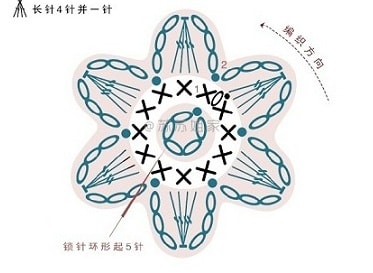 - Схема вязания цветочка клубники. Вяжем желтой и белой пряжей. По этой же схеме вяжется зеленой пряжей соцветие клубнички.