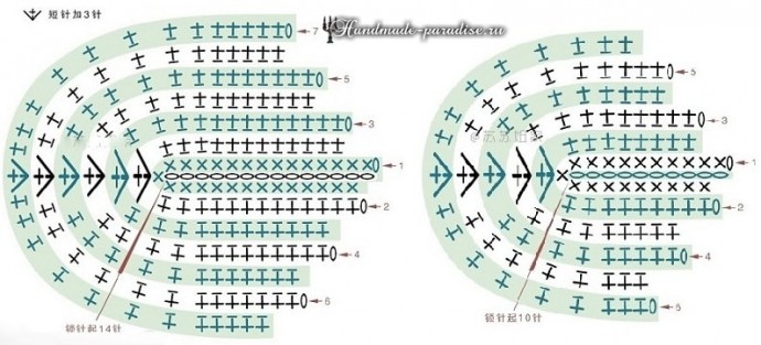 - Схемы вязания листиков клубники, двух размеров. Вяжем зеленой пряжей.