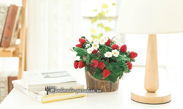 Схемы вязания декоративного комнатного растения — цветущей клубники, для украшения интерьера или создания подарка ручной работы.