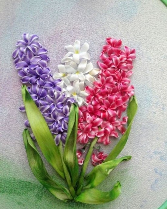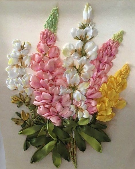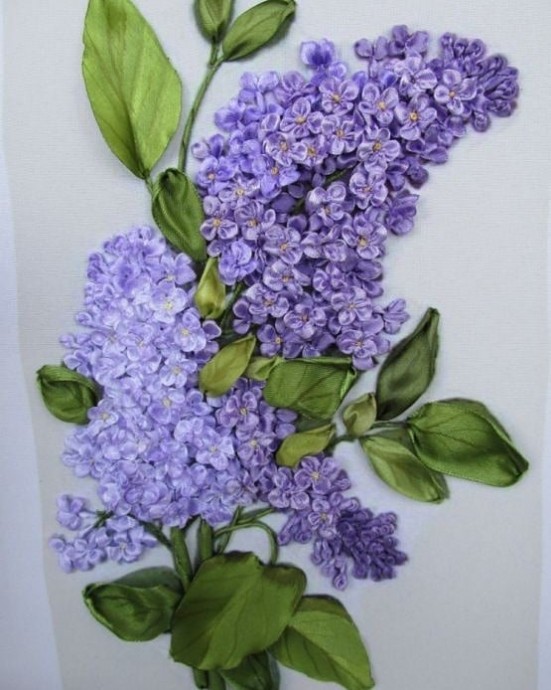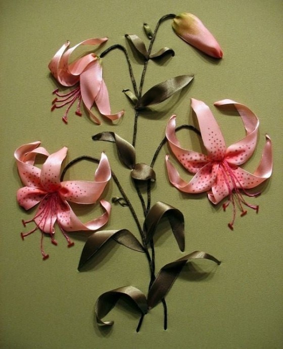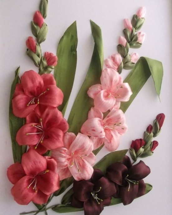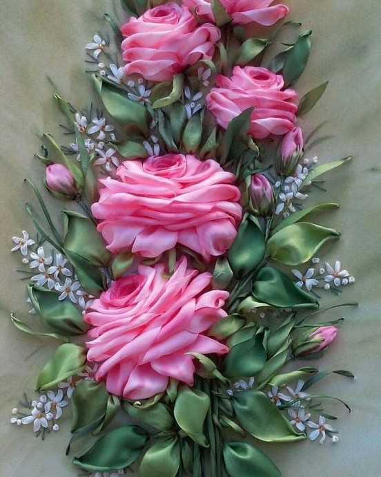 Изумительной красоты вышивка цветов лентами создает иллюзию живых цветов.