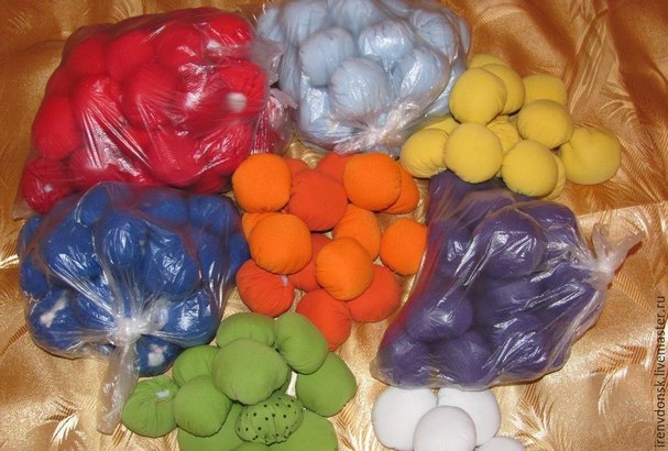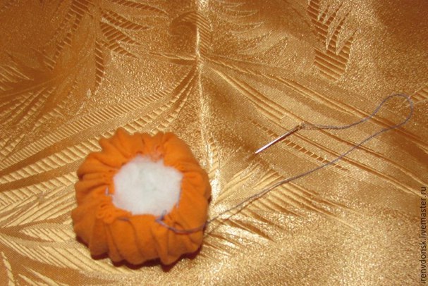 Вкладываем в нашу заготовку наполнитель (синтепон, поролон и т. д.), стягивая нитку, получаем мягкий шарик.