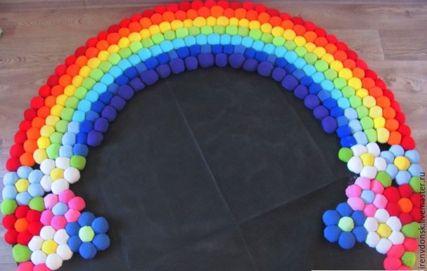 Наклеив все шарики согласно намеченному эскизу, в середину вшиваем матрасик из поролона диаметром 1 м и толщиной 3-4 см, зашив поролон в клеенку.