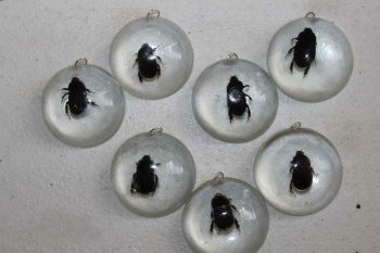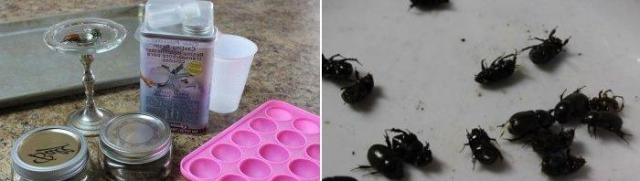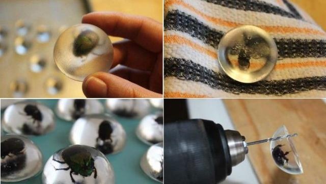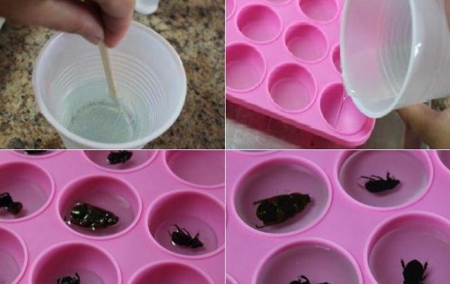 4. Возьмите аккуратно пинцетом жучков или цветочки и выкладывайте их на поверхность слегка застывшей смолы.