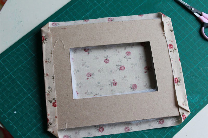 5.Затем отрезаем кусок ткани по размерам рамки, оставляя отступы 2-2,5см. Укладываем ровно ткань, синтепон, картон. Следим, чтобы ничего никуда не съехало!