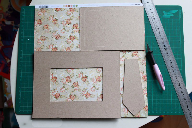 Затем приклеиваем бумагу на заднюю часть нашей рамки и разрезаем, проведя по надрезам на картоне.