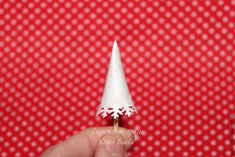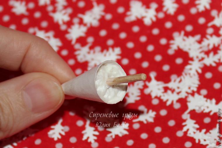 Набиваем конус бумагой, пропитанной клеем ПВА. Вставляем кусочек деревянной шпажки или зубочистки, это будет ствол нашей ёлочки.