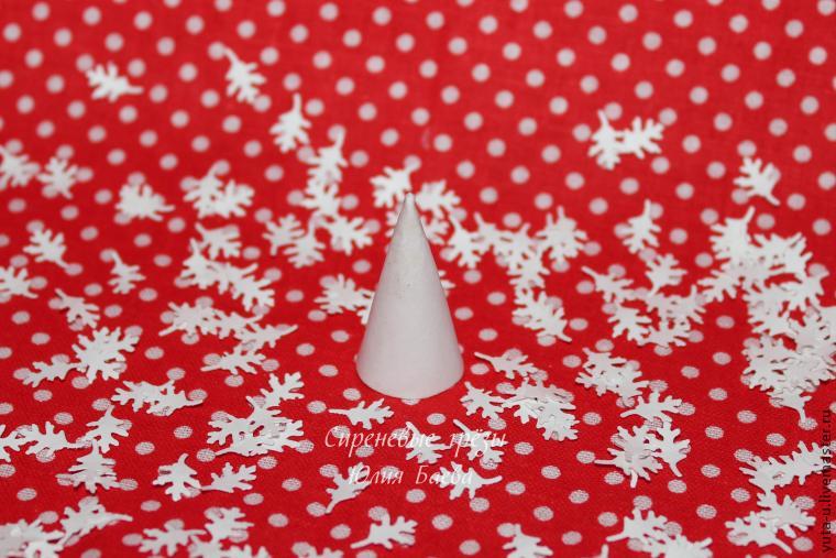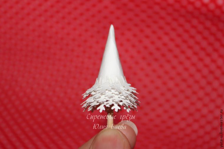 Приклеиваем хвою по кругу. Если у вас ёлочка из белой бумаги, не советую использовать ПВА, так как он желтеет при высыхании, а если ёлка цветная, то можно клеить и на ПВА.