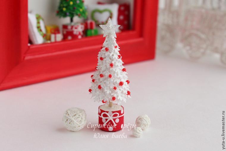 Финальный этап — украшение ёлочки. На ветки я приклеила шарики из полимерной глины, но можно воспользоваться и обычным бисером. Ну, и куда же без звезды на макушке.