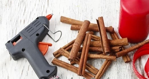 Нам понадобится: большие толстые свечи, палочки корицы, термопистолет с горячим клеем и джут, шпагат или красивые ленты.