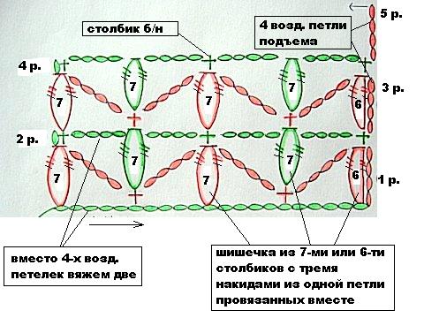 Для того чтобы уменьшить дырочки между «шишечками» уменьшим число воздушных петелек между шишечками, поэтому набирайте начальную цепочку, учитывая что раппорт составит 6 возд. петель.