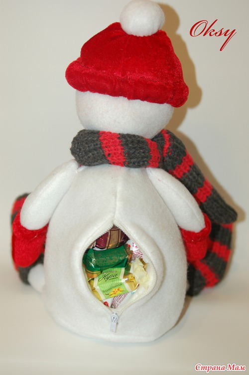 Внутри моего снеговичка прячутся сладости, которые так любят дети. В зависимости от возраста деток вовнуть можно положить то, что считаете нужным. Таким образом, это не просто мягкая игрушка, но и своеобразная упаковка для Вашего подарка.