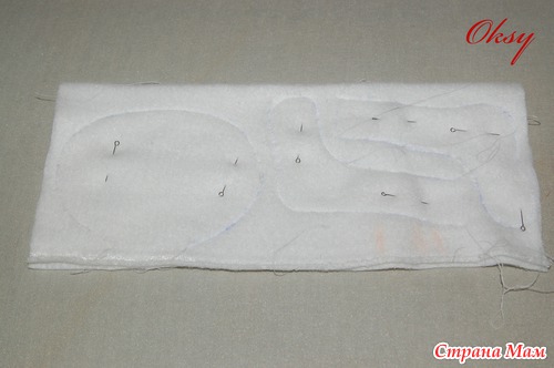 Берем внутреннюю деталь туловища изнаночной стороной к себе. Выкраиваем из цельного куска синтепона двойную деталь по выкройке туловища и контрастной по цвету нитью большими стежками пришиваем синтепон к детали туловища. Делаем это для того, чтобы при выворачивании синтепон не сбился в кучку, а контрастную нить потом легче увидеть и вытащить.