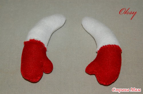 Деталь ручек переносим на белый флис, но не полностью, а только ручку без рукавичек. Рукавички выкраиваем из красной ткани. Сшиваем по отдельности, выворачиваем, набиваем синтепоном.