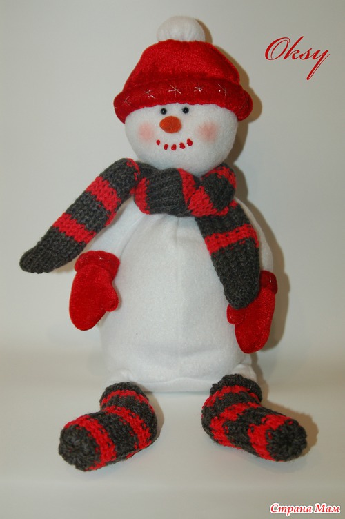 Покажу еще один вариант оформления аналогичного снеговика. Это девочка. На ножках у нее самые обычные носочки для младенцев, т.е. самомго маленького размера. Варежки и шапочка сшиты из махрового носка. Это совсем упрощенный вариант, так как в данном случае шапочку даже не надо кроить, просто отрезаете носок, подворачиваете края и пришиваете к голове.