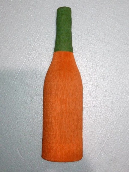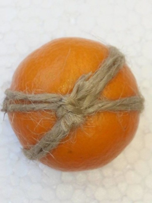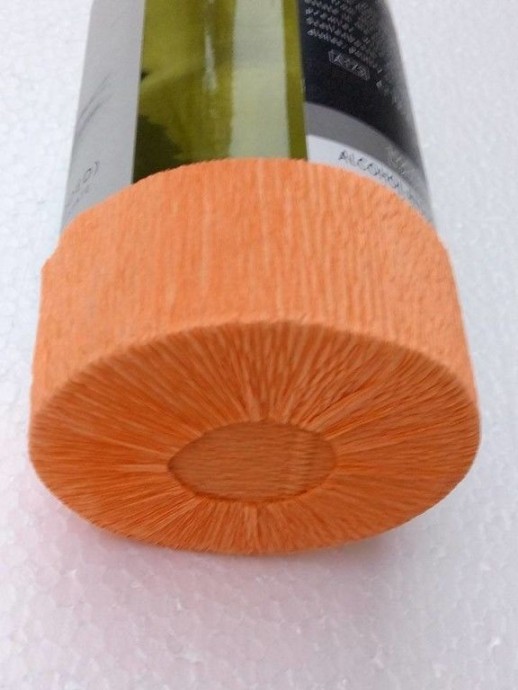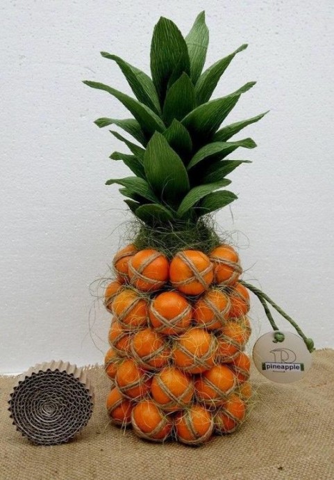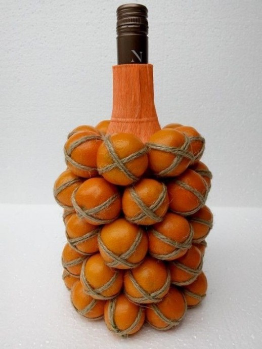 Оригинальная идея праздничного оформления из апельсинов с помощью бутылки и бумаги.