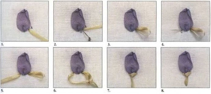 Вышивка лентами: часть 3 Автор Полякова Татьяна На изнаночной стороне завязываем узелок.Пришиваем все цветы.Продеваем зелёную ленту в иголку.Делаем прокол иголкой с изнаночно...