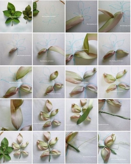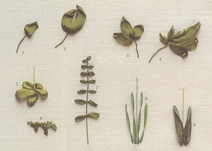 Вышивка лентами: часть 4 Автор Полякова Татьяна Аналогично выполняем все листикиВот что получилосьС изнаночной стороны обрезаем концы наискосок.Вдеваем зелёную нитку, завязыв...