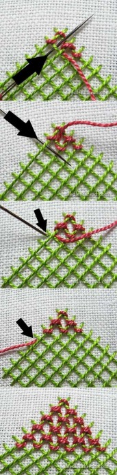 Он выполняет функцию основы полотнища. После прошивания выполняется вышивание поперек. При этом необходимо оставлять нити продола чередуя их сверху и внизу. Внешне ячейки после таких манипуляций должны напоминать технику штопанья.