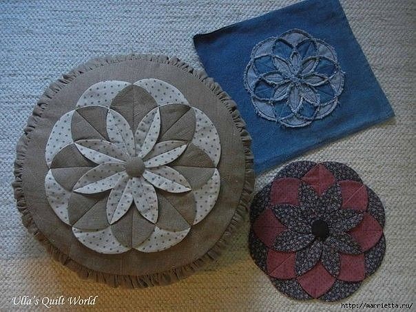 Удобная подушечка с цветком в технике пэчворк может быть выполнена в ярких контрастных цветах.