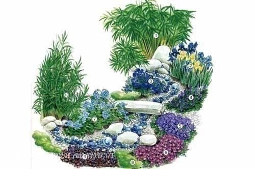 Цветочный ручей является одним из вариантов сухого ручья в ландшафтном дизайне. Для него можно использовать те же виды плотных компактных голубых, сизых и фиолетовых растений, что и для сухого ручья. Можно рассмотреть это на примере схемы цветника ниже.