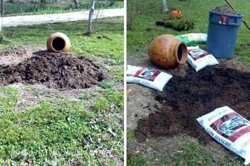 4.Подготавливаем почву под цветник. Выбираем почву под «русло» цветочного ручья, складывая ее на одну строну там, где мы будем устанавливать контейнер.