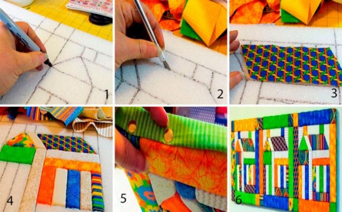 Нанесите клей на полосу пенопласта и прикрепите лоскуток ткани, заправляя её края в прорези, используя пилочку.
