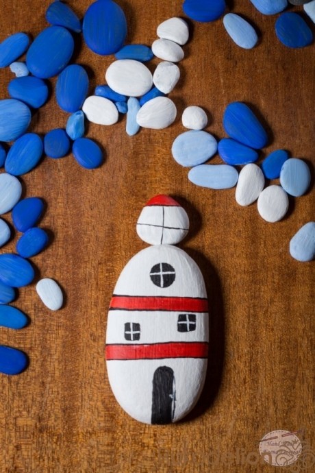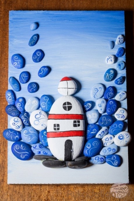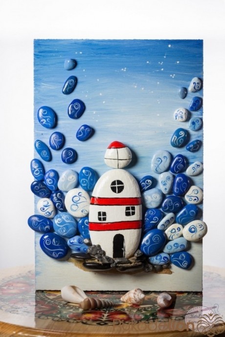 Маяк с морскими брызгами из гальки это оригинальное украшение любой комнаты.