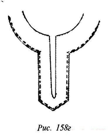 * Очень оригинально будет выглядеть обтачка из какой-либо дорогой и красивой ткани (например, из материала со стразами или вышивкой). Такую деталь придется прикрепить вручную, а также можно приколоть ее с лицевой стороны и затем с изнанки пришить бегущими стежками (рис. 158д).