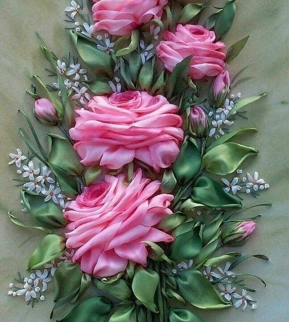 Розы, вышитые лентами, непередаваемо хороши.Они кажутся живыми.