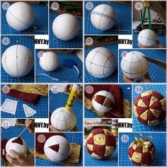 Светлана, пенопластовые шары разлинеиваются и прорезаюся ножом для бумаги по этим линиям. Потом в эти пазы всовывается ткань. Клей не используется.