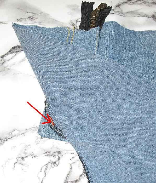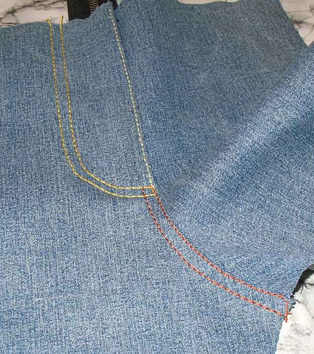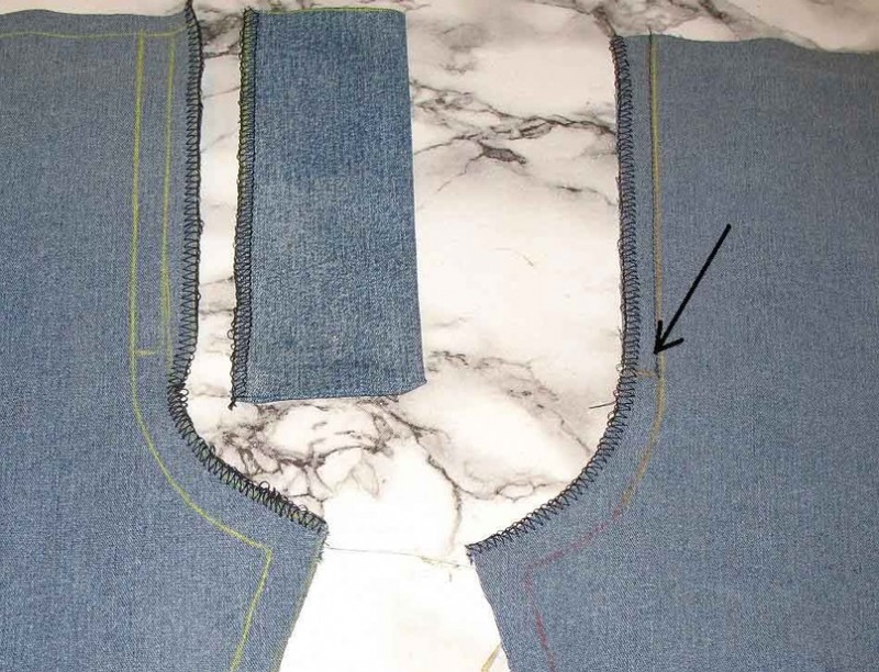 Далее - стандартная обработка откоска и притачивание гульфика к правой половине (притачивается на 1 мм. левее от намеченной линии)Я обработала срез на правой половине по среднему шву на оверлоке, но в джинсах, когда идет двойная отстрочка, этот срез обычно не обработан вообще, поскольку припуск левой половины его обычно перекрывает. Более того - в грубых тканях делаются небольшие надсечки, чтобы припуск беспрепятственно заутюживался по дуге.