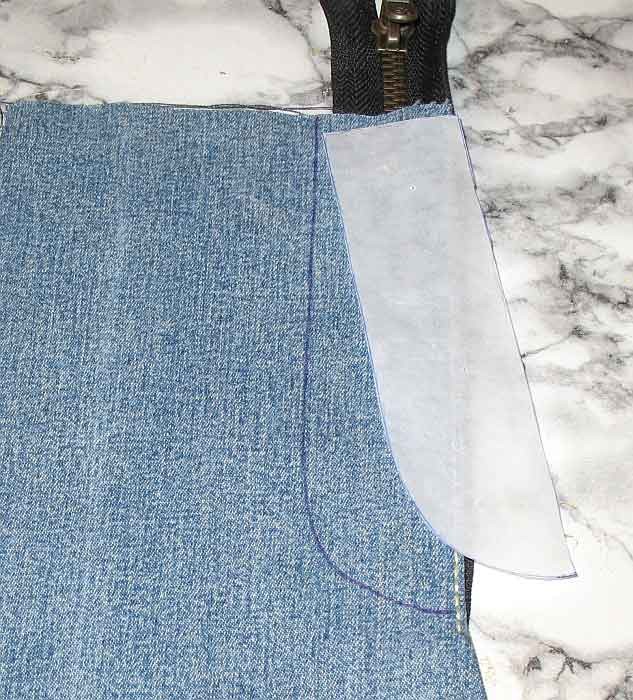 С лицевой стороны по лекалу отмечаем линию отстрочки (или строчим сразу же по лекалу). Обратите внимание - с изнаночной стороны конец невшитой половинки молнии отгибаем и закрепляем булавкой