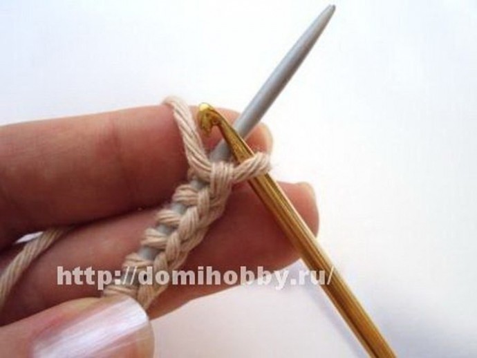 Далее переместите рабочую нить за спицу, снова *захватите крючком нить перед спицей и вяжите следующую воздушную петлю цепочки, а на спице набрана новая петля.