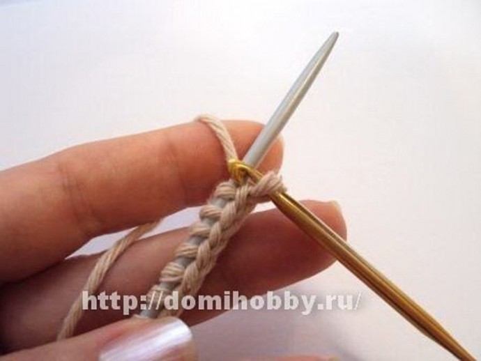 Затем петлю с крючка наденьте на спицу и начинайте вязать выбранным узором.