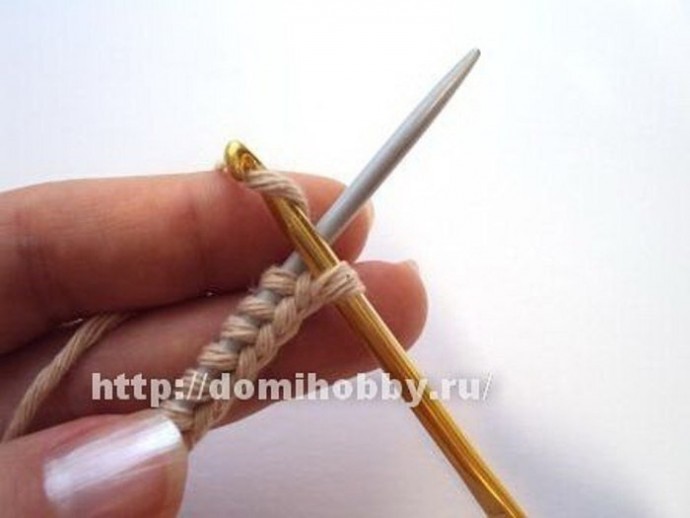 Для начала набора петель сделайте начальную петлю крючком, расположив в левой руке спицу, заведите рабочую нить за спицу. Затем захватите крючком основную нить перед спицей и протяните ее через начальную петлю.