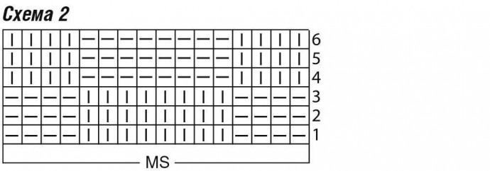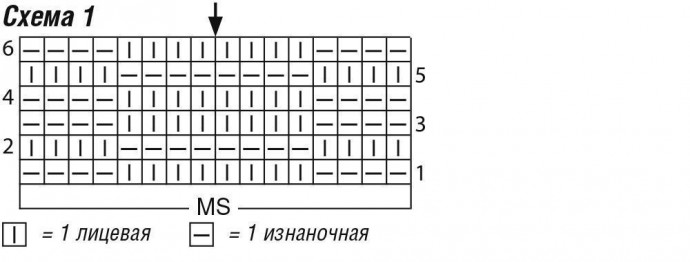 Ряды в прямом и обратном направлении (число петель кратно 16 + 2 кромочные) = вязать согл. схеме 1. На ней даны лицевые и изнаночные ряды. Начать с 1 кромочной, раппорт постоянно повторять, закончить 1 кромочной. Постоянно повторять 1–6-й ряды.