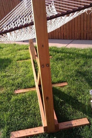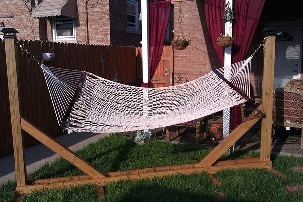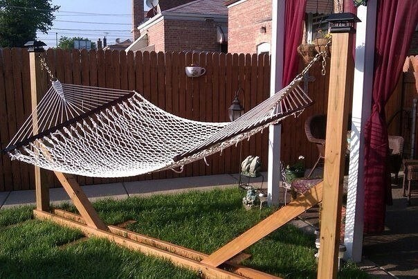 Если у вас на участке еще нет больших деревьев для того, чтобы закрепить на нем гамак, то смастерите вот такие опоры для него их бруса.