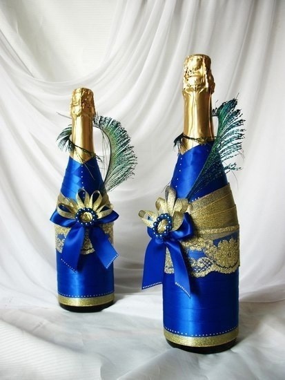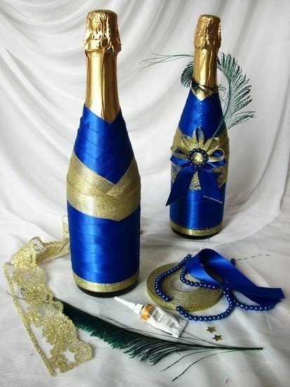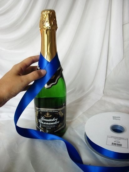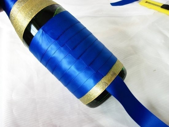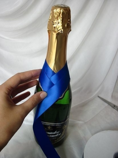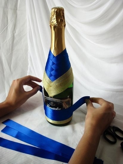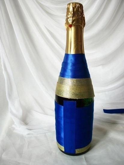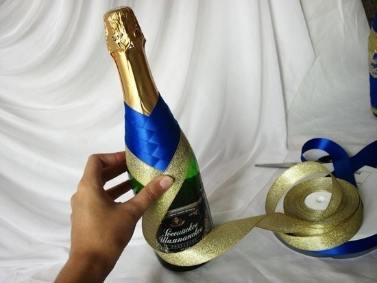 Красивый декор бутылки рождается благодаря широким атласным лентам разных цветов.