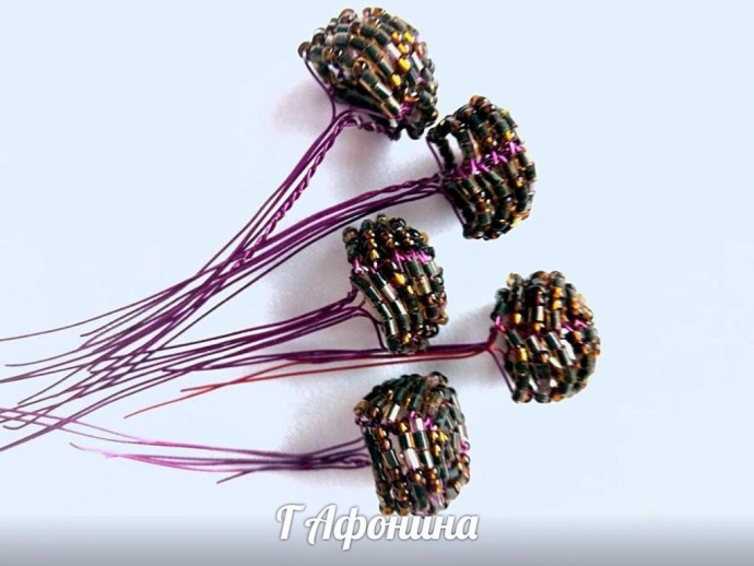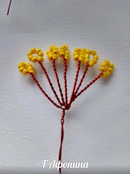 На основную ось набрать 3 бледно-желтых бис, 3 болотного цвета, 14 розового, 3 бордового. Остальные ряды видны на фото. (Плетение французское. Серединку цветка я собирала на такую...