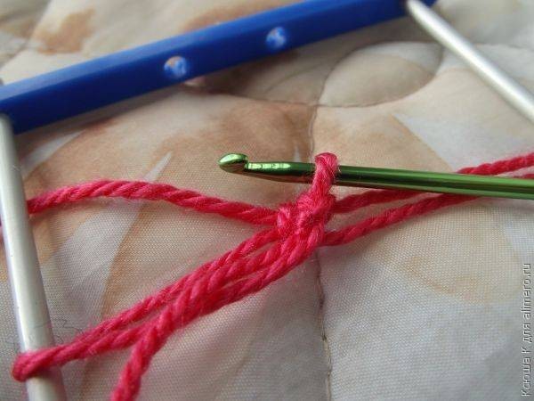В качестве оборудования используется двузубая вилка, крючок и пряжа.