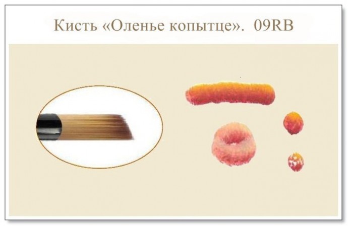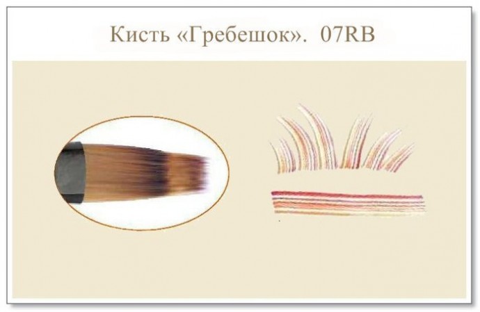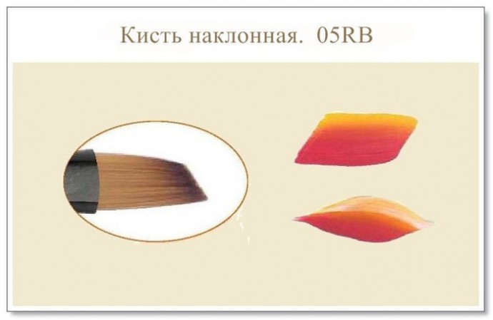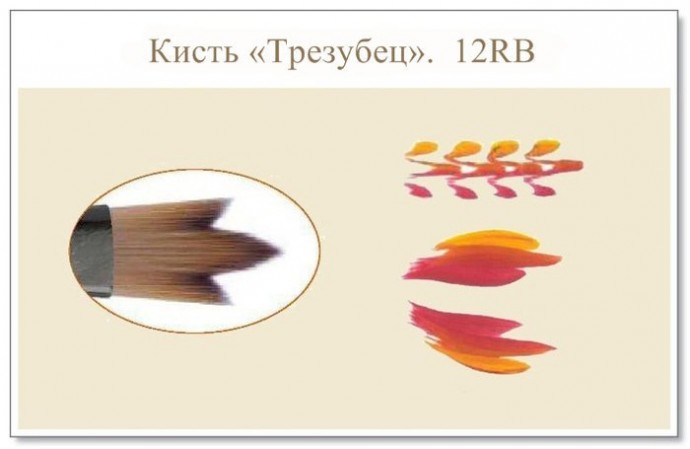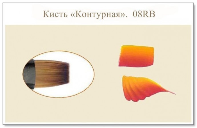 Эта плоская кисть с фигурным краем позволяет выполнять мазки сложной формы. Для создания более живописных мазков можно набирать дополнительные цвета на выступающие края. Это создаст впечатление, что мазок выполнен в несколько приемов. Помогает ускорить процесс росписи.